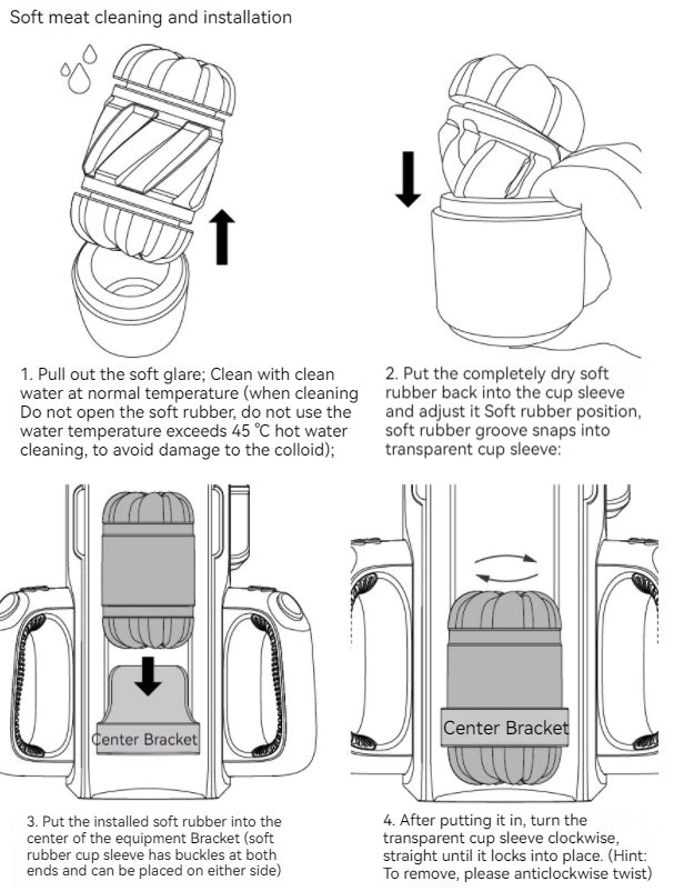 Post-use, carefully remove the soft insert and cleanse it with room-temperature water. Allow it to air-dry naturally or gently pat it dry using a non-depilating towel. When cleaning, avoid opening the soft insert, and refrain from using water exceeding 45°C to prevent any potential damage to the soft insert.
